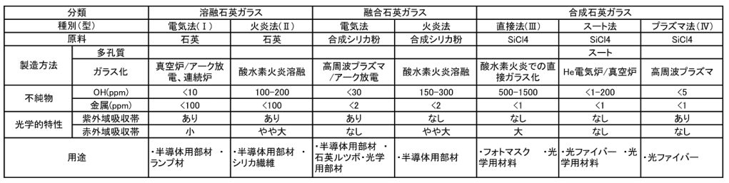 純度的には、溶融石英ガラス<<融合石英ガラス<合成石英ガラスという順になる。気泡は溶融石英ガラス<融合石英ガラス<合成石英ガラスである。コスト的には融合石英ガラスは溶融石英ガラスとオーバーラップする。したがって現在溶融石英ガラスを使用しているが、合成石英ガラスを使いたいユーザー向けの用途に使用できる。この分野は半導体である。