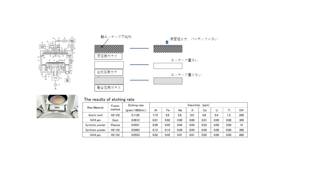10月25日に特許が公開になった。特開2022-162943の「合成石英ガラス製エッチャーパーツ」である。これは合成シリカ粉をプラズマ溶融してエッチャーパーツにするものだが、この時点では優れていると思っていた。しかし、最近になってどうも違うようだということになった。私が開発した「天然代替合成シリカ」を溶融したものは、酸水素溶融であってもエッチングレートが極めて少ないことが分かったのだ。これには不純物が関係している。