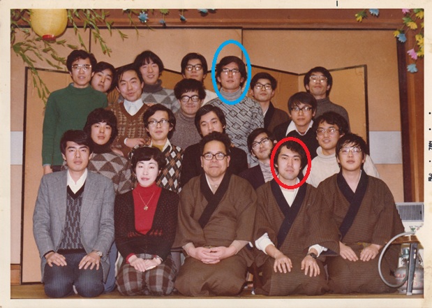 これは大学卒業の時に、講座の人たちと温泉に行った時の写真である。22歳であろうか? 教授、助教授、技官2人、大学院2年生5人、ほかが大学4年生である。最後列の髪の長いのが私である。青で囲んだ吉田と私が大学院に進学となっている。赤で囲んだ男が、現在高級アルコール工業の社長の川合である。川合は東工大の研究生になって、親父が作った高級アルコール工業に就職した。この当時の人に卒業以来あったことはない。川合は偶然、30年前にアムステルダムのスキポール空港であったことがあった。お互い分かったくらいだから顔があまり変わっていなかったのだろう。